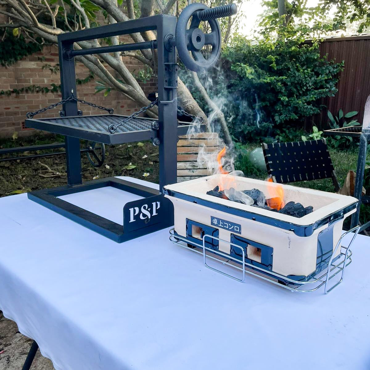 It's small enough to fit over the top or just inside the rim of many domestic fire pits and even tabletop hibachi grills.