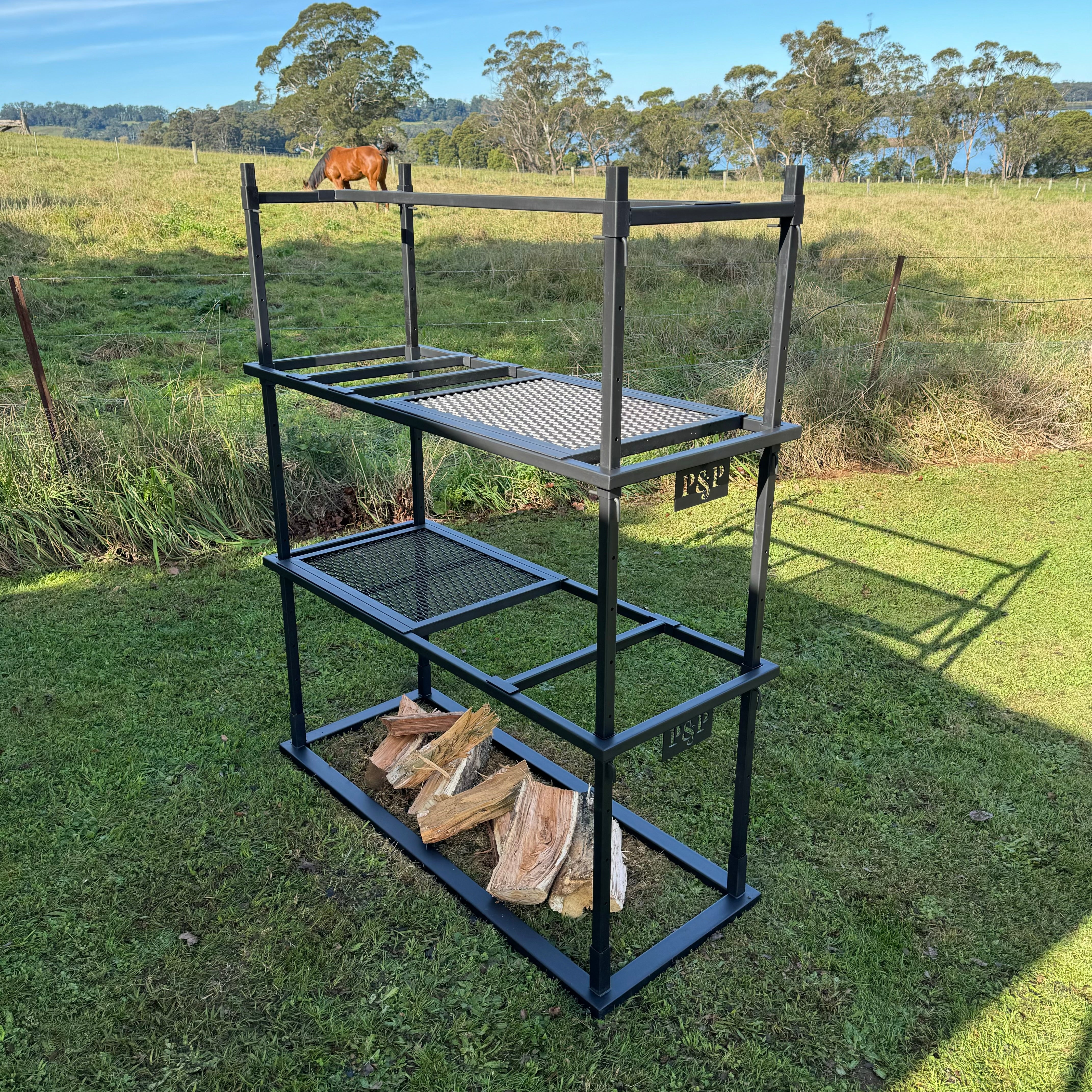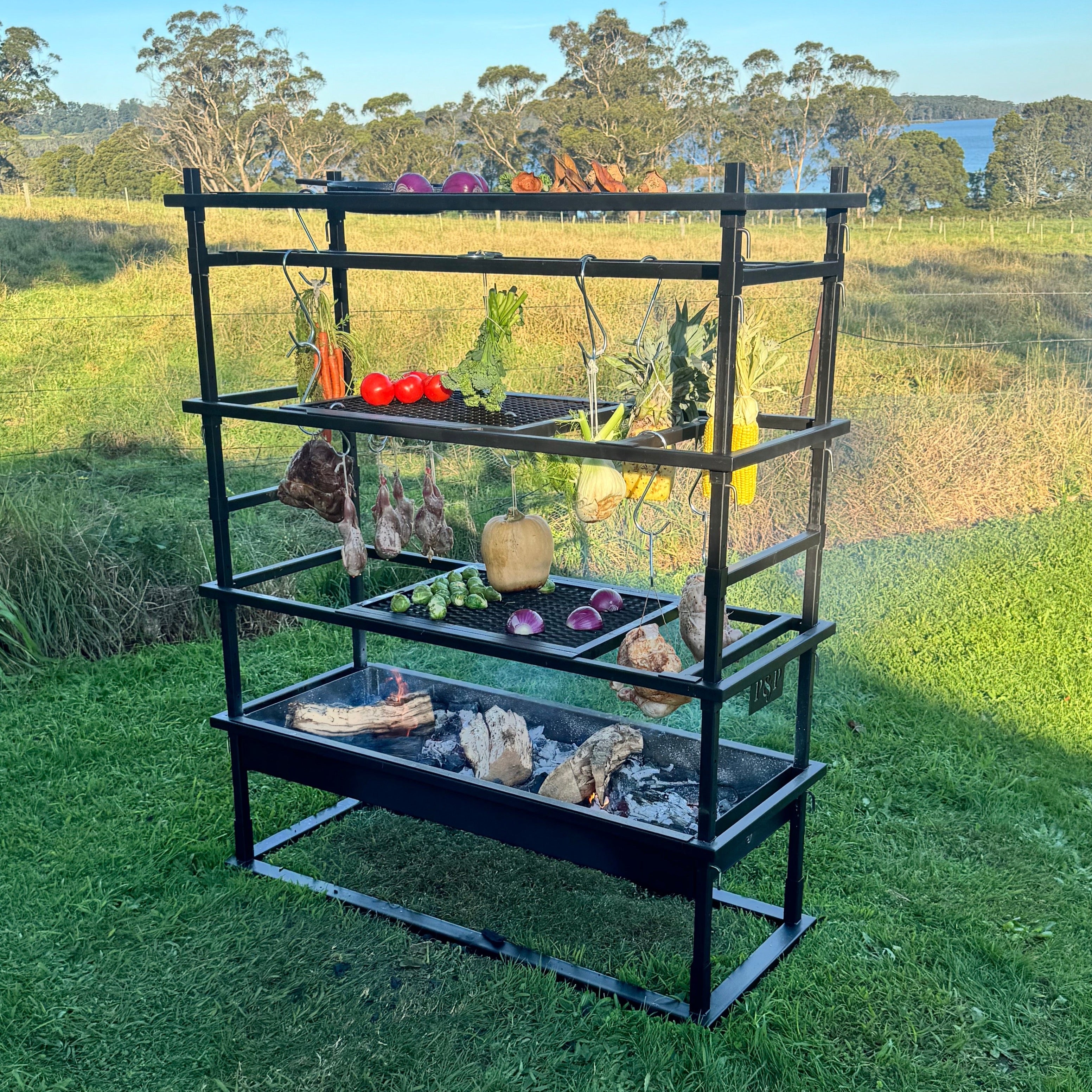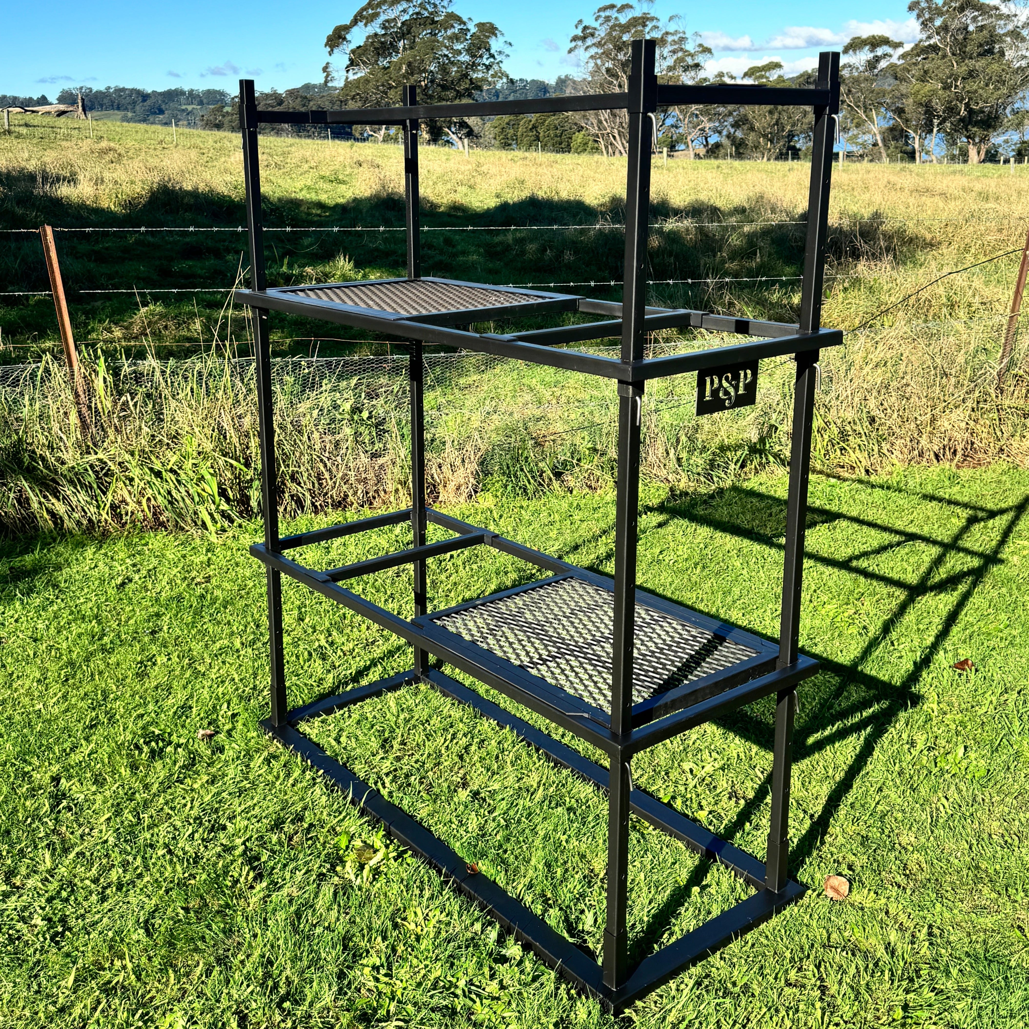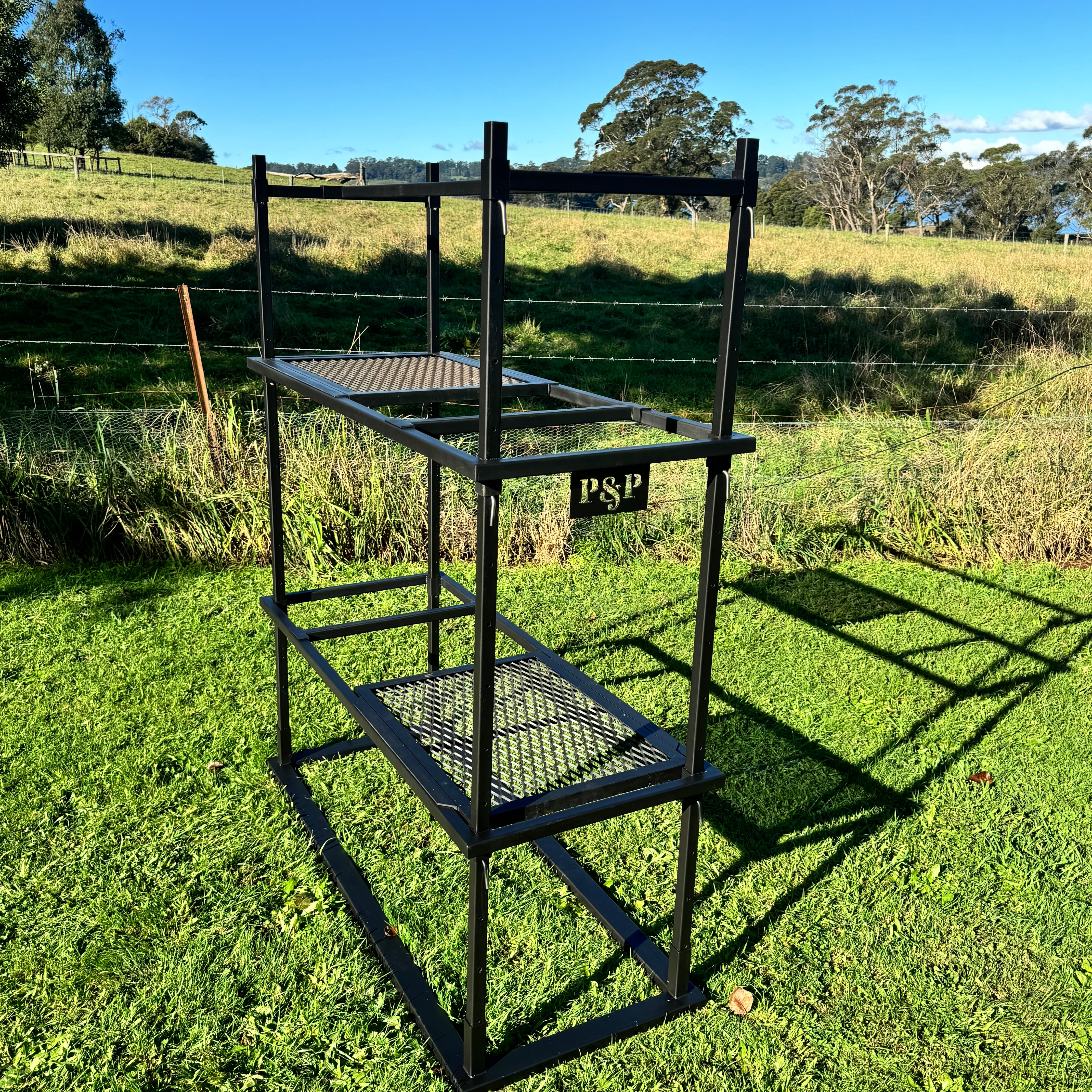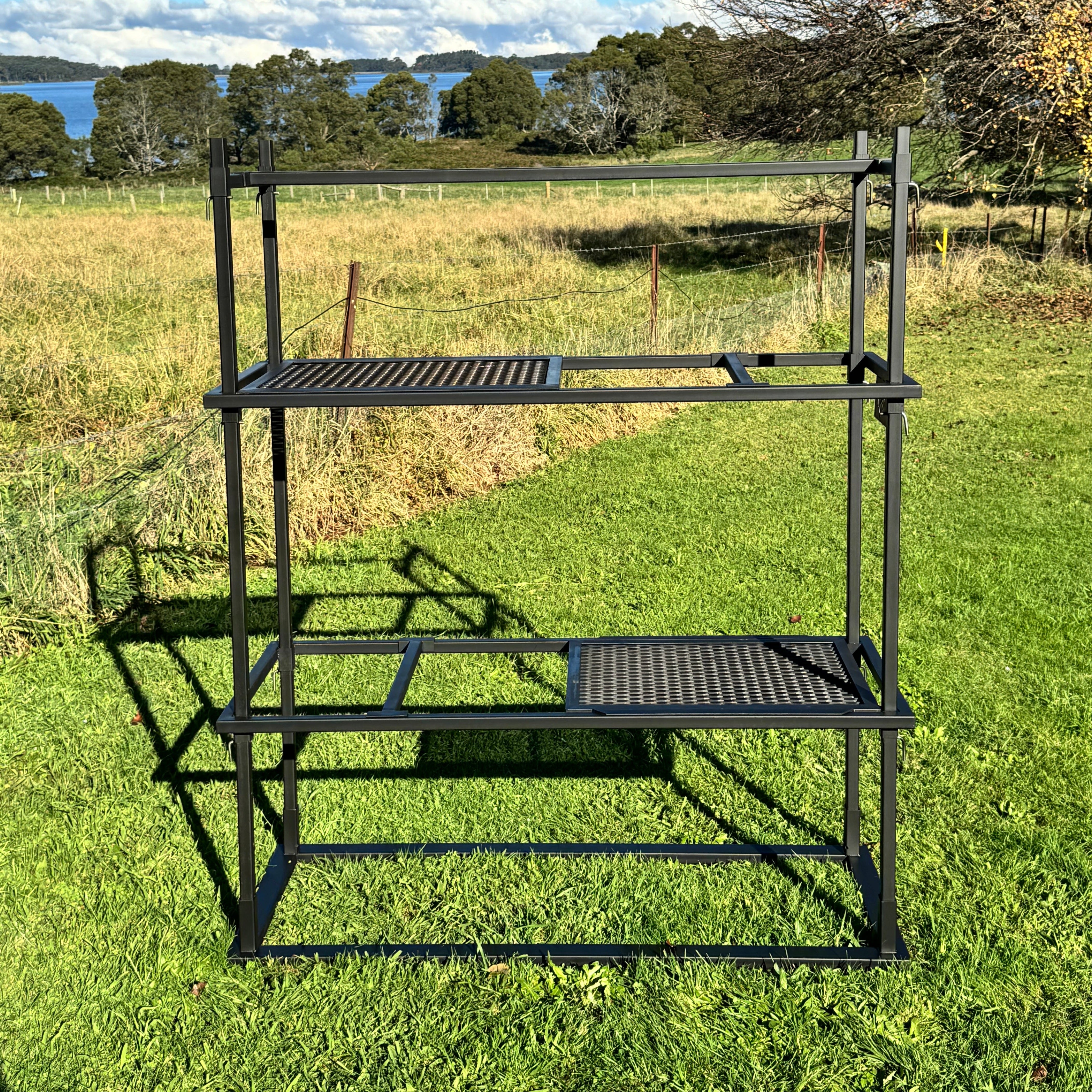 No pit. No drama. Just good fire cooking. Portico 3 is made for those who pack light but still want a proper feed. It ditches the built-in fire pit so you can throw it over a campfire or coals on the road. It’s lighter to haul, quicker to set up, and still gives you two mesh grills and plenty of hanging options. Ideal for camping, road trips, or blokes who don’t want to lug a ton of steel but still want to cook properly.