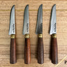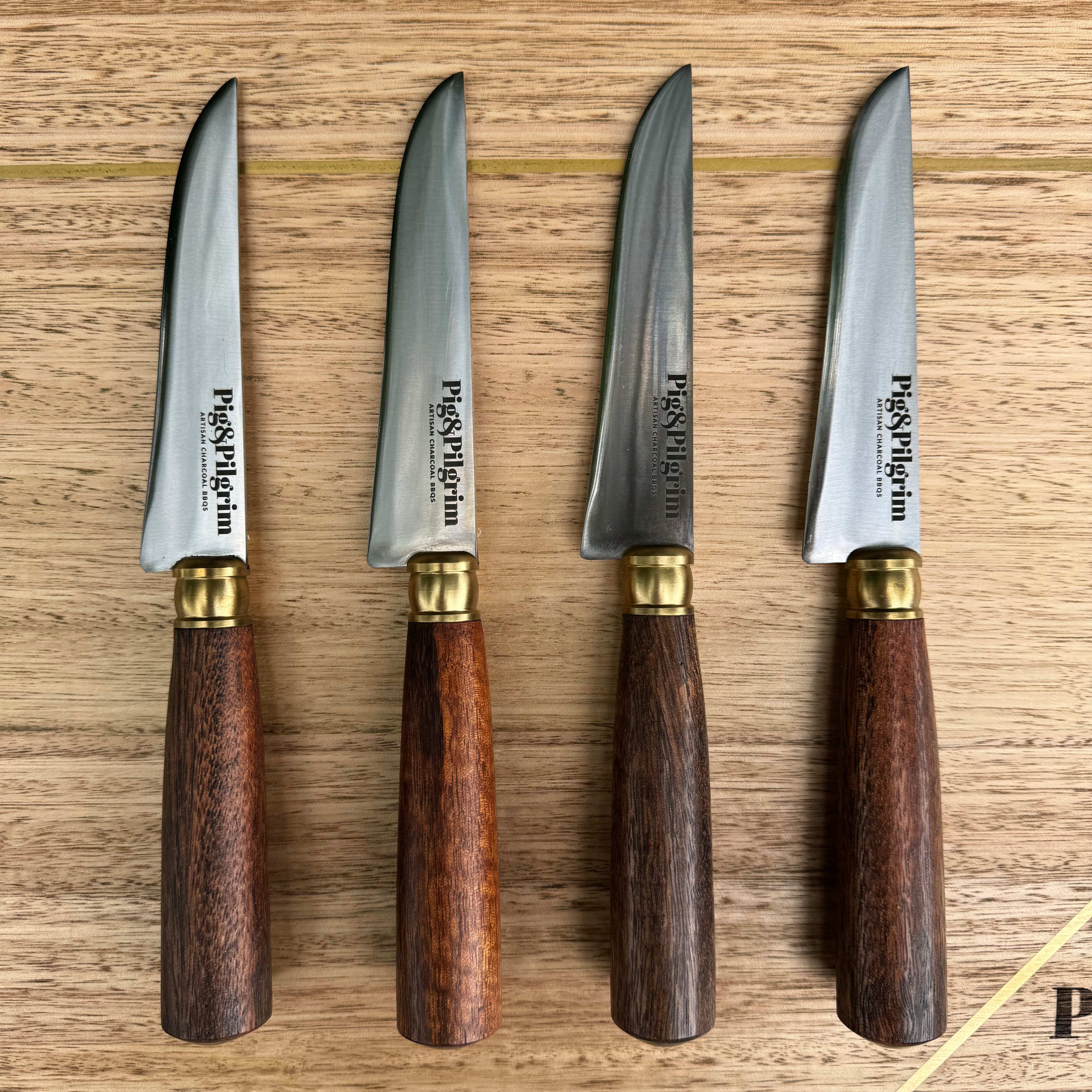 These aren’t your run-of-the-mill steak knives. This set of four is beautiful hand crafted from stainless steel by our Brazilian friends and fitted with oiled, champagne wood handles that actually feel good in your hand. Finished off with a brass bolster.