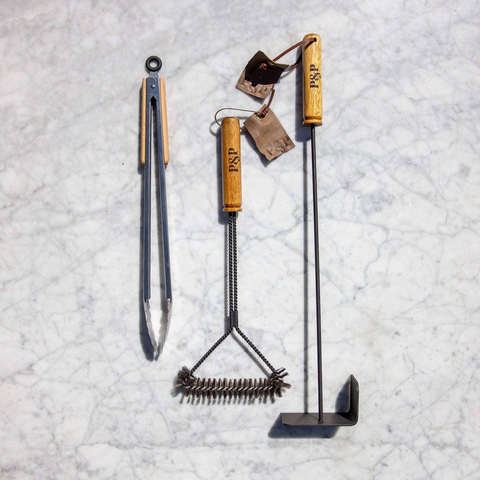 Each includes a Tasmanian Oak handle or inlay designed and built by Charlie and stamped with the P&P motif.