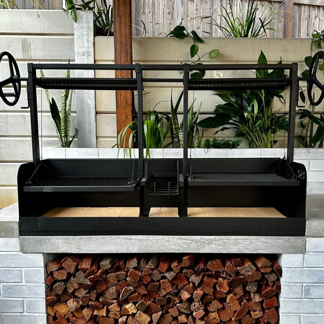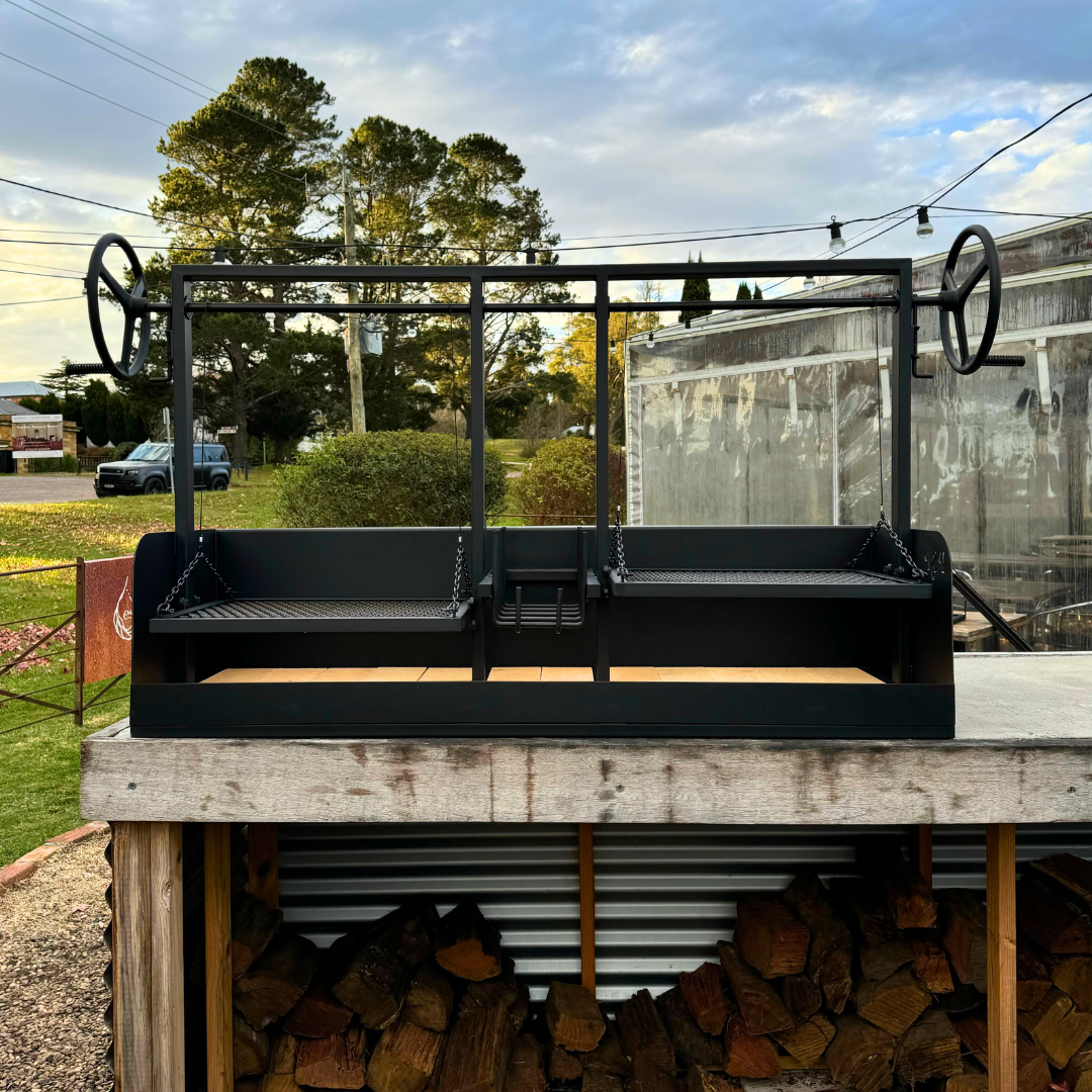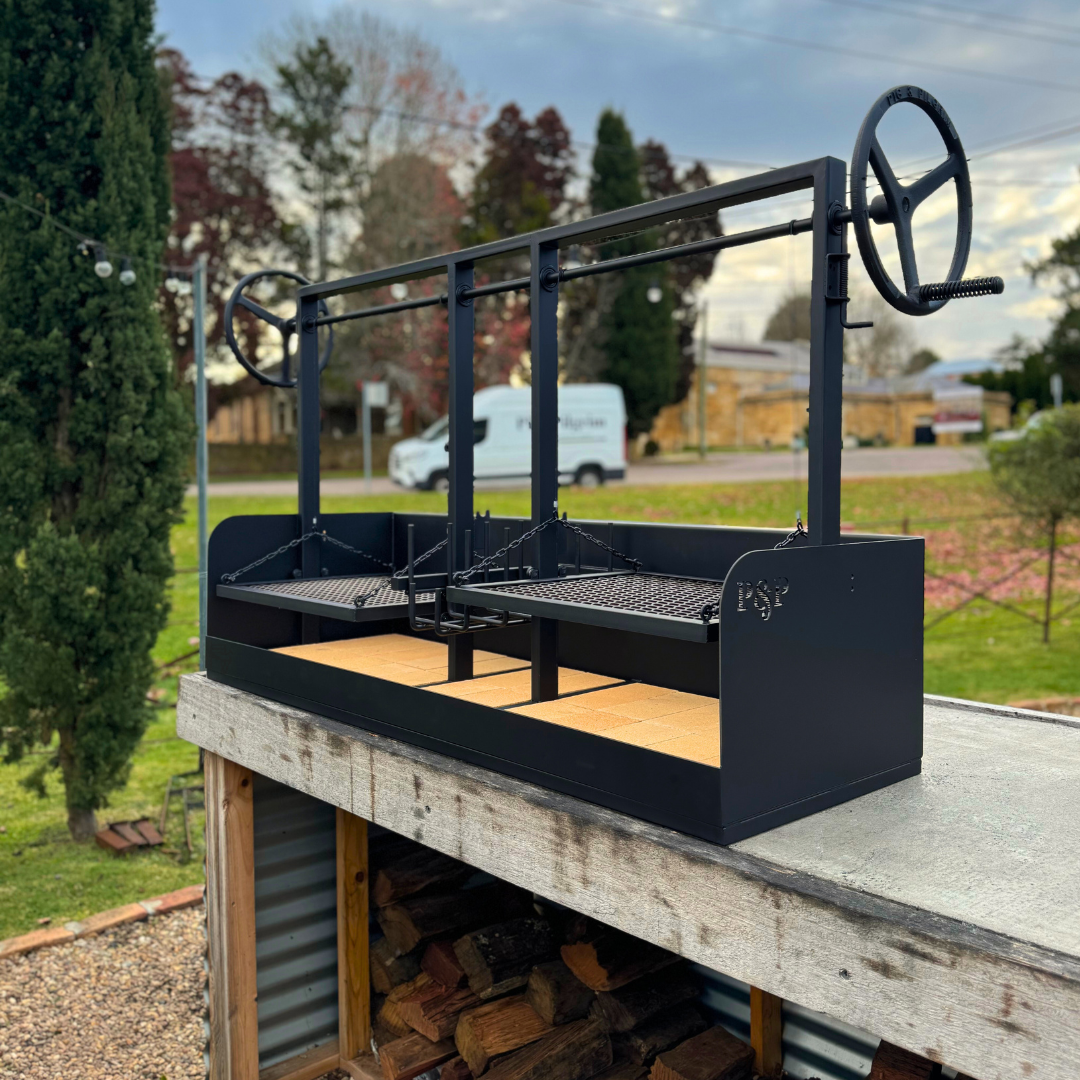 The Deuce in the Middle Legless (or 'DIM' Legless as we've nicknamed it) is a beautiful piece of kit with two heigh adjustable 580 x 485 grill plates and it also has the new addition of a brasero in the centre.