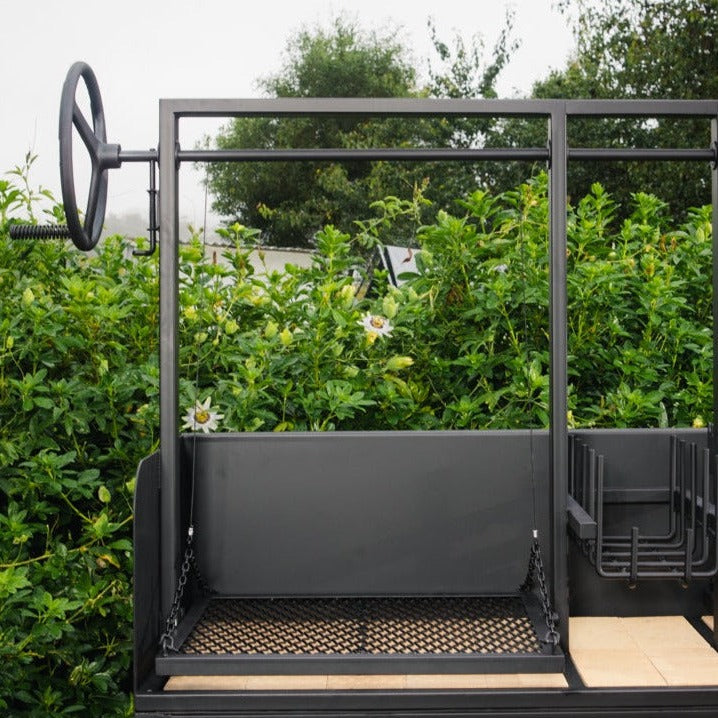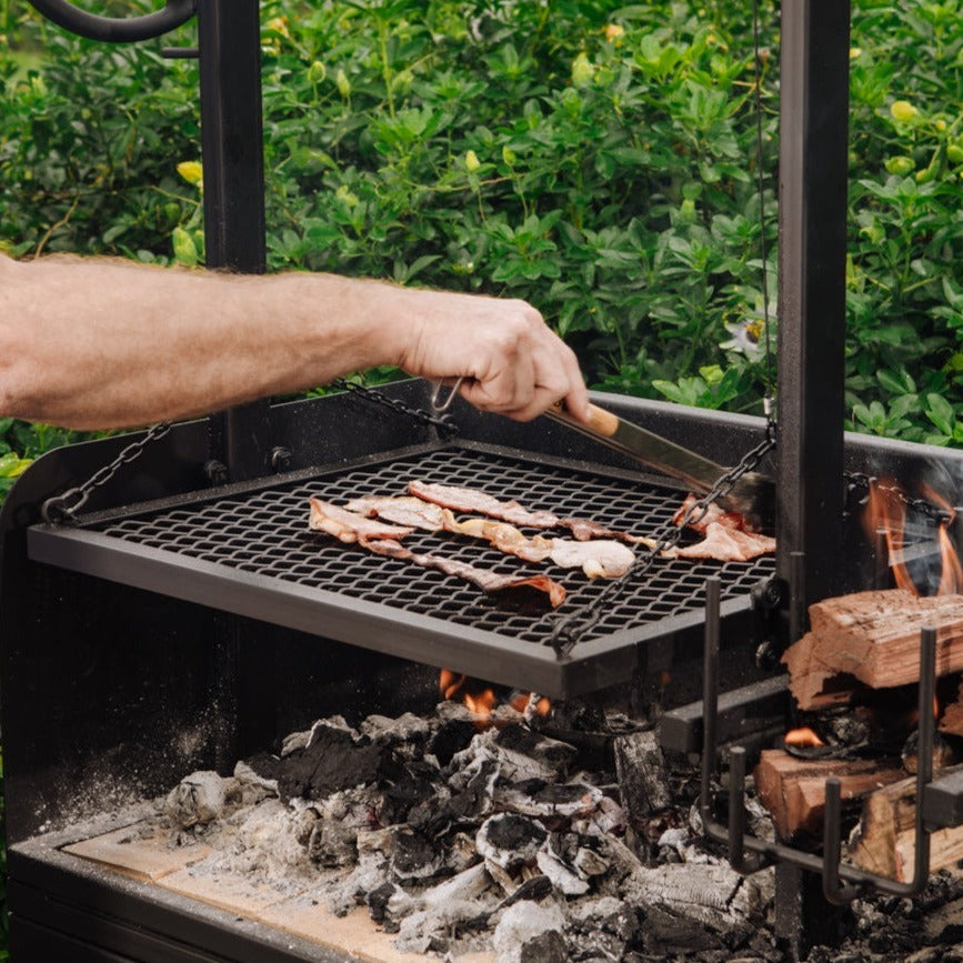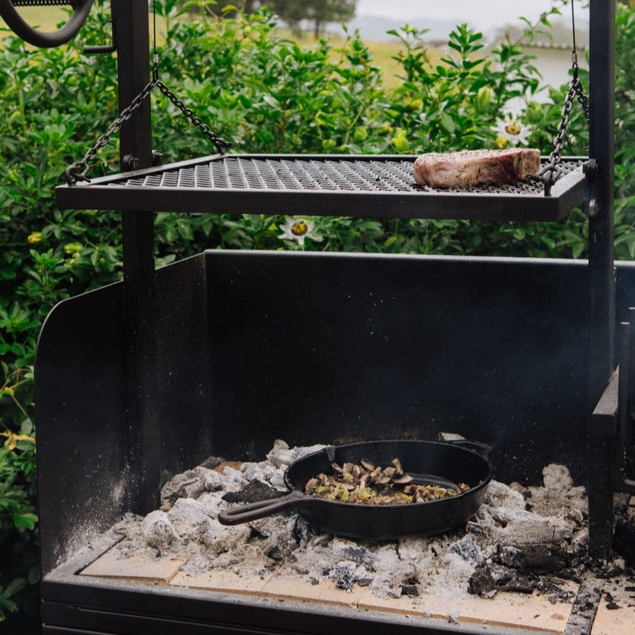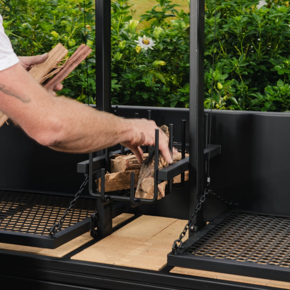 Now you not only have the option to raise or lower your grill plates easily, you can also stack and light wood in the brasero, burn it down to charcoal and then it move across to your cooking surface underneath the grill. That makes it perfect for longer cooks as you can continue to add wood and create more charcoal as the cook progresses.